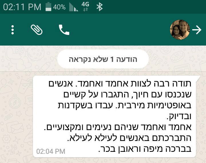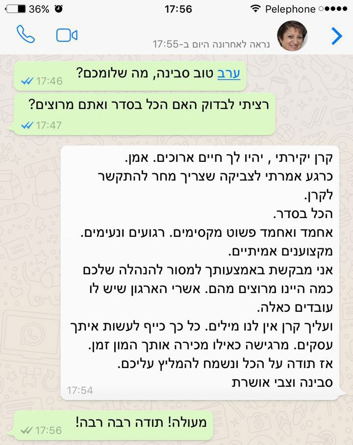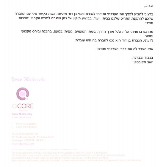 הגברת קרן - תיאמה את כלל האופרציה המסובכת, תמיד זמינה לכל שאלה ובעיה. אדיבה ושירותית והכי חשוב, מקצוענית !. מעודכנת בכל פרט ופרט ברמה הטכנית הגבוהה ביותר.