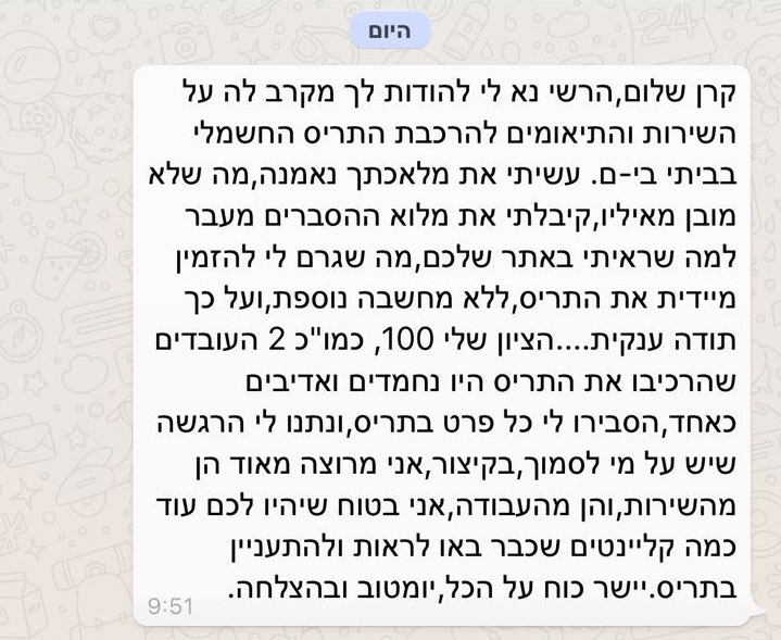מקצוענות ושירות, הינם הפרמטרים החשובים ביותר אפילו מעבר למחיר. בימים אלו זה לא דבר מובן מאליו במדינה שלנו, וזאת ללא ספק קבלתי מהגורמים הבאים:
